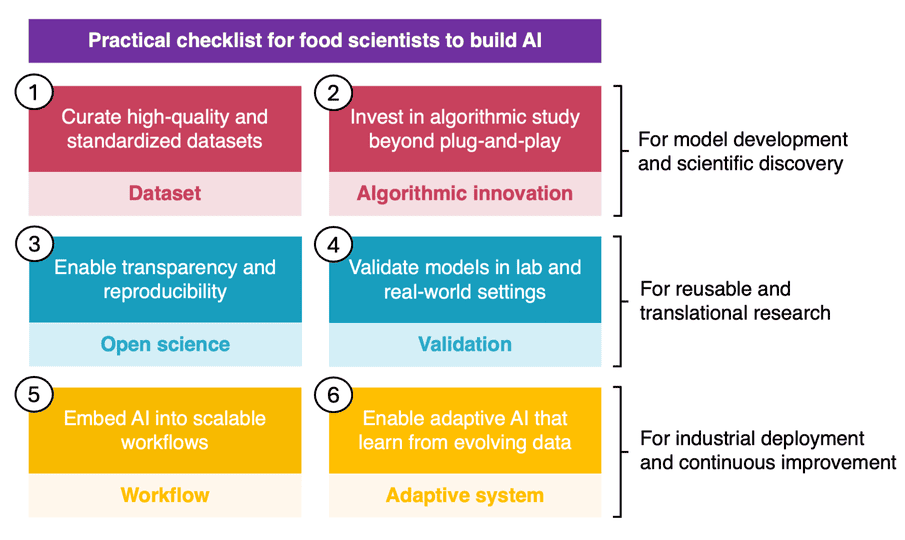 To support day-to-day implementation, we propose a six-point practical checklist that food scientists can use when planning AI projects. The checklist covers critical steps: data creation, algorithm development, transparency and reproducibility, validation through lab and real-world experiments, building scalable workflows, and enabling adaptive learning.